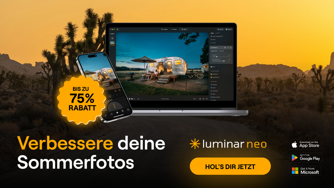 Hol Dir Luminar Neo jetzt zu einem stark reduzierten Preis und erlebe Bildbearbeitung neu gedacht. Egal ob Landschaft, Porträt oder kreative Projekte: Mit den intelligenten AI-Tools gelingen beeindruckende Ergebnisse im Handumdrehen.